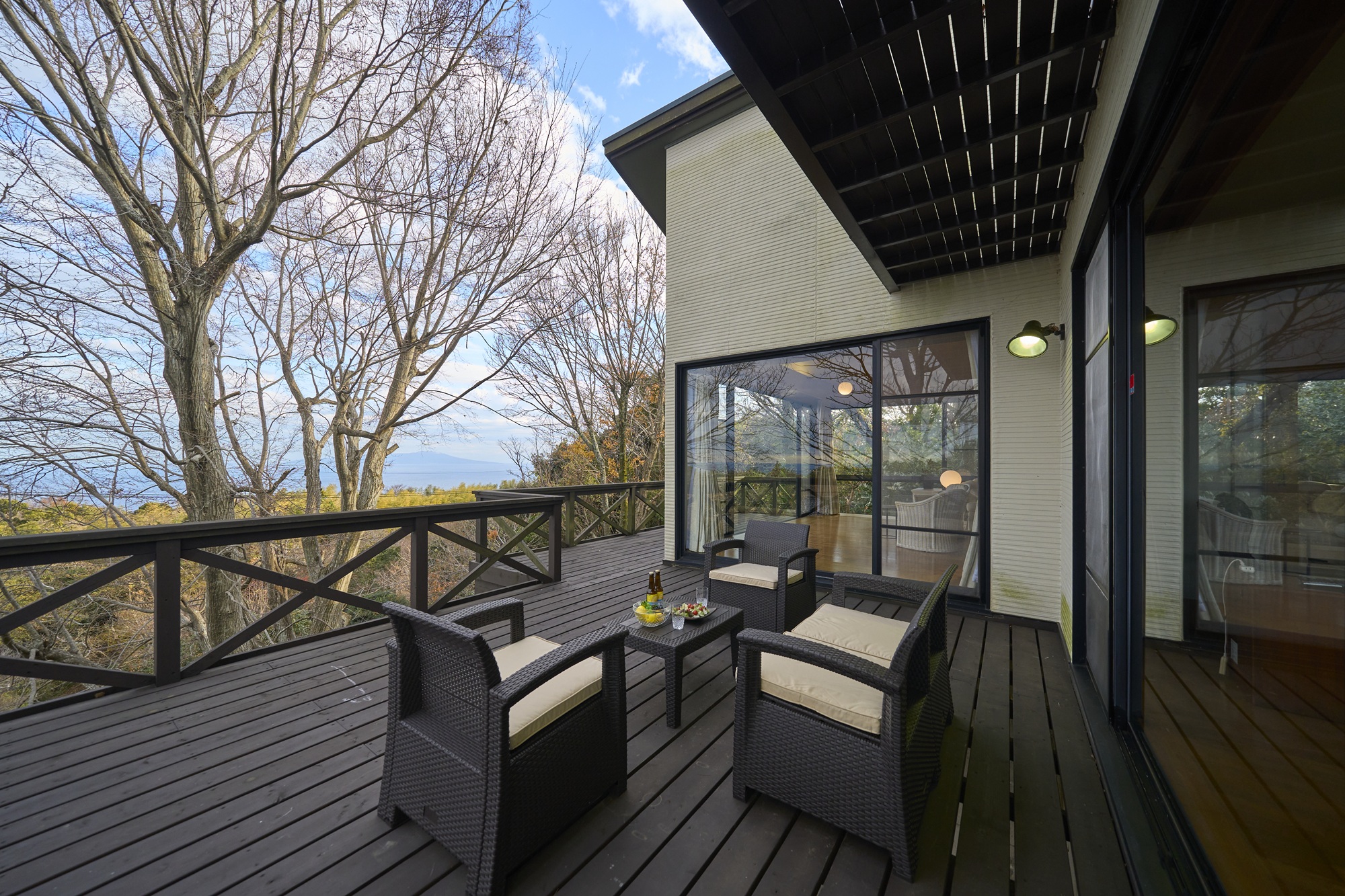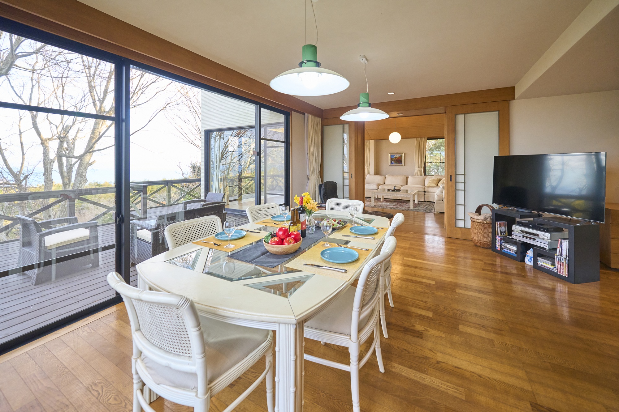 リビングとダイニングの先には、心地よいウッドデッキ。海と緑を感じながら、バーベキューや食事を楽しむことができます。新緑の季節、深まる緑、色づく秋、澄んだ空気の冬