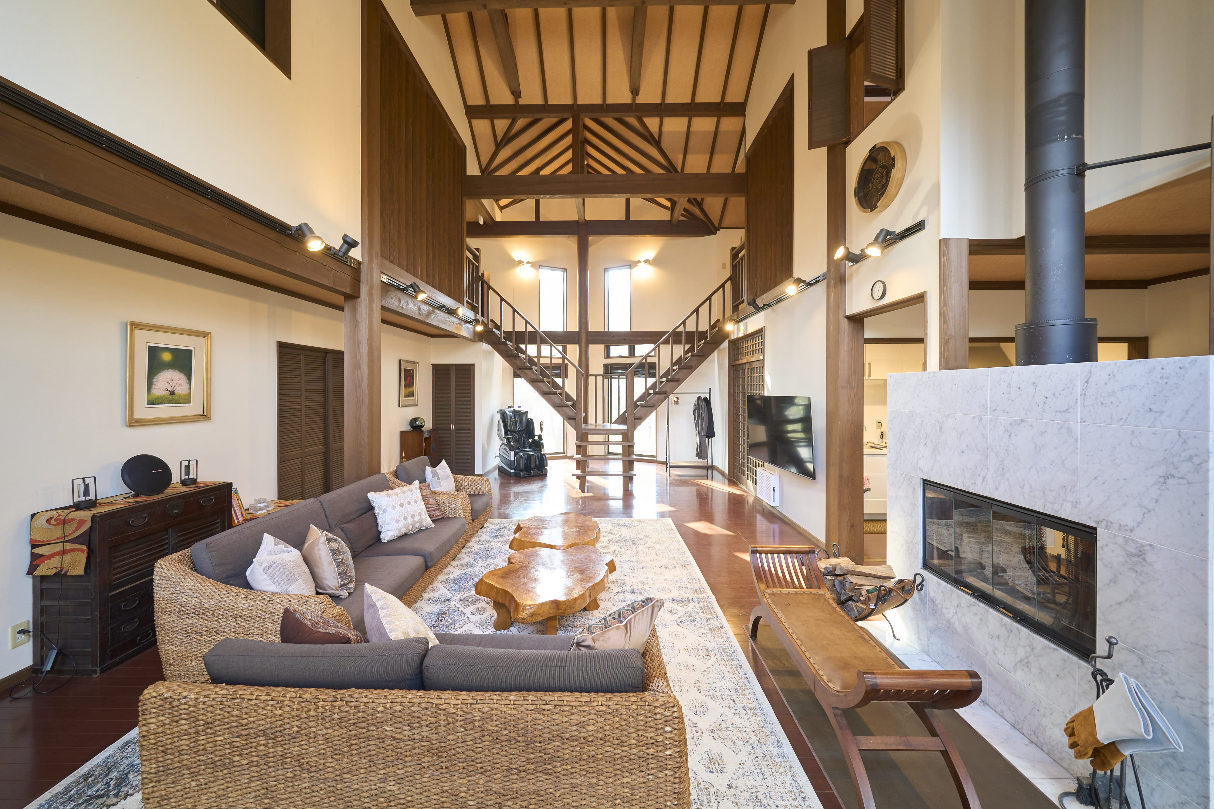 室内に入れば、約8メートルの吹き抜けリビングが広がる開放的な空間。