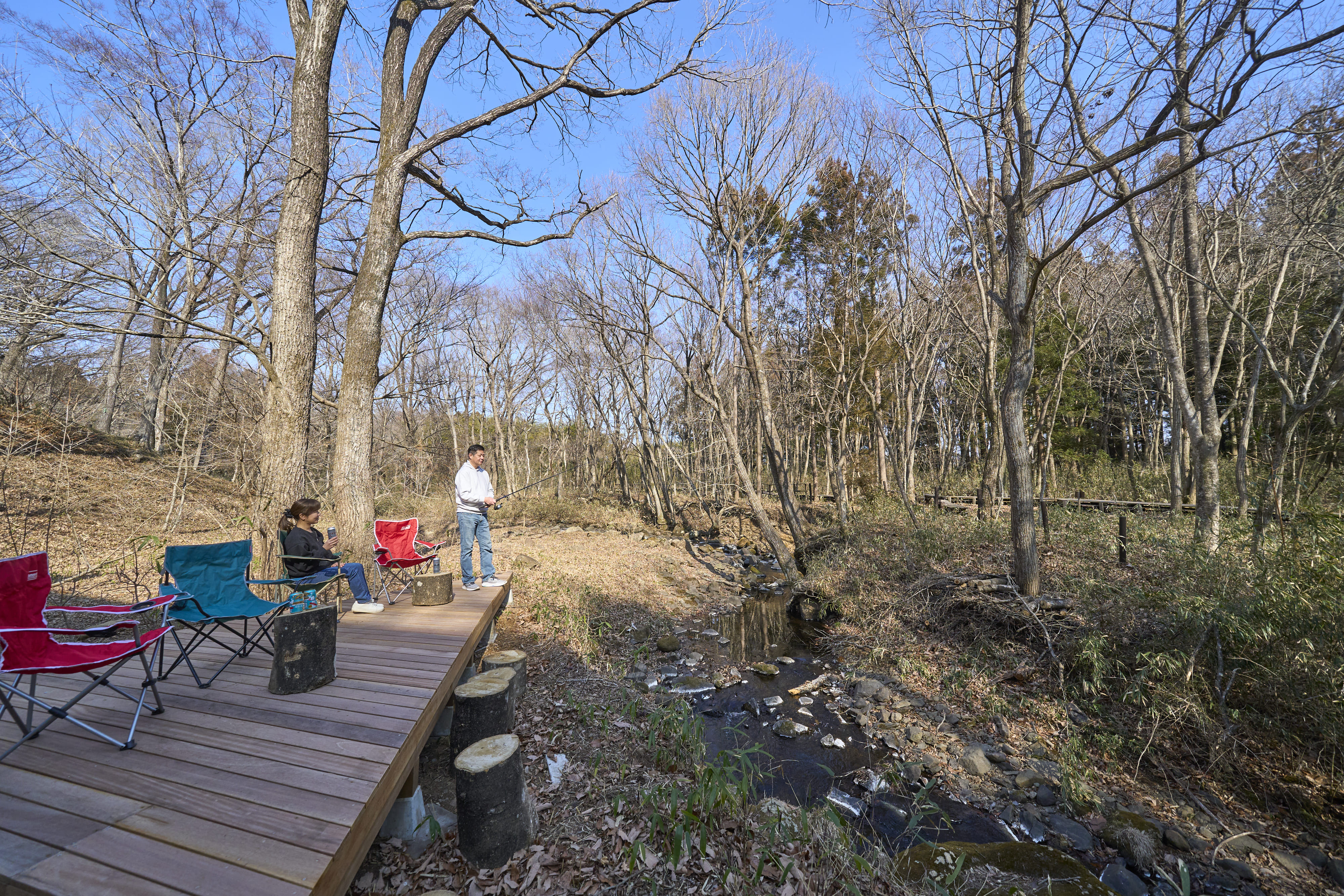 ウッドデッキに出れば、下に流れる小川のせせらぎ。