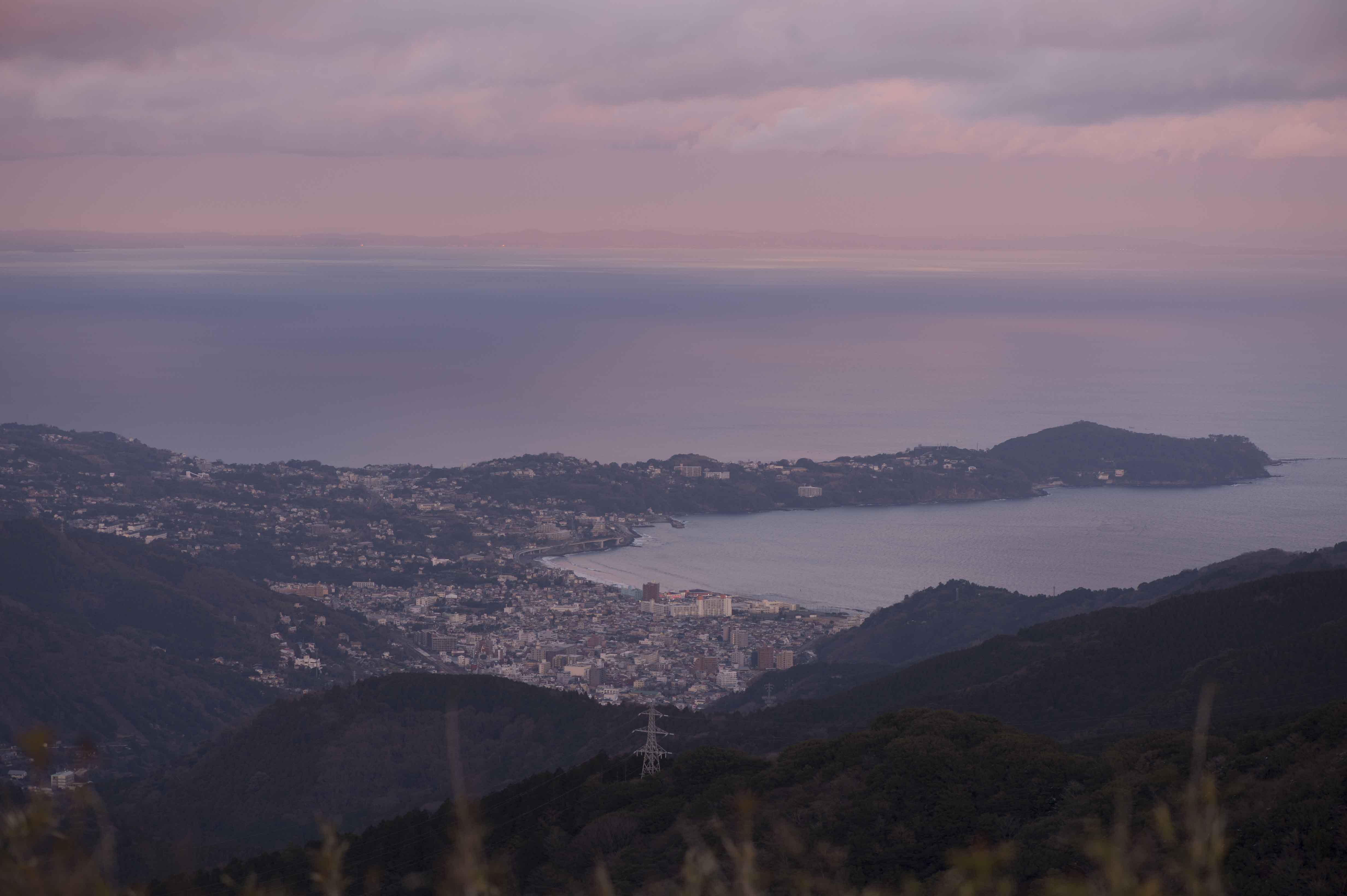夜、リビングの窓の先に熱海の空が開く
